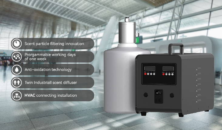 The B10000 HVAC System Scent Diffuser is designed for industrial-level aroma delivery, featuring patented particle filtering and anti-oxidation technology to maintain scent quality at its best. Equipped with a twin air pumping system, it allows programmable operation with two different timers for precise scent control. Perfect for large spaces with HVAC systems, such as hotels, airports, and shopping malls, this diffuser ensures consistent and effective fragrance distribution.